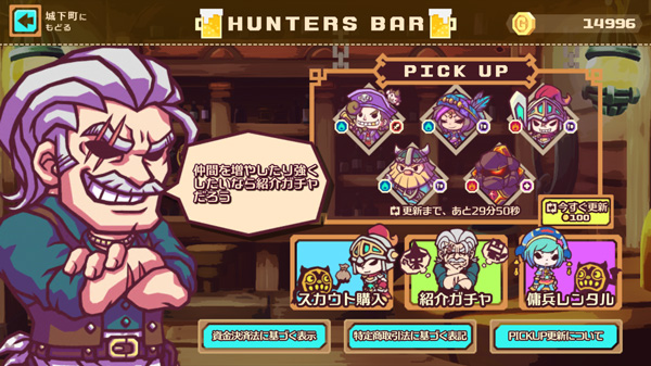 ▲スカウト購入。その時点で解放されているハンターを任意に選んで購入可能。そのぶん、ガチャよりも1体あたりに必要なゴールドが割高。